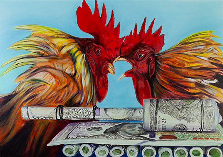 Nel primo dei due dipinti dedicati al tema del conflitto, due galli alfa si affrontano in un duello primordiale, rappresentazione archetipica dell'aggressività come istinto naturale e antropologico. Tale dimensione, tuttavia, passa in secondo piano, poiché in primo piano campeggia la figura di un carro armato costruito interamente con banconote da dollari, chiara allusione alla matrice economica e capitalistica della guerra contemporanea.