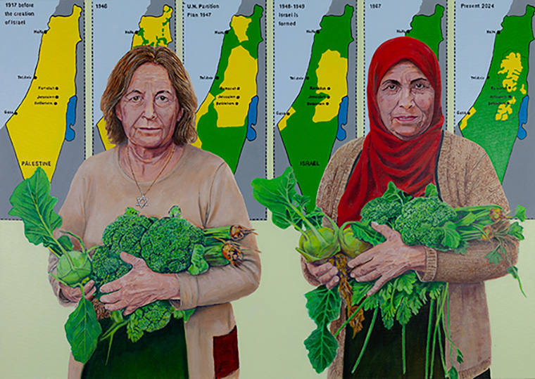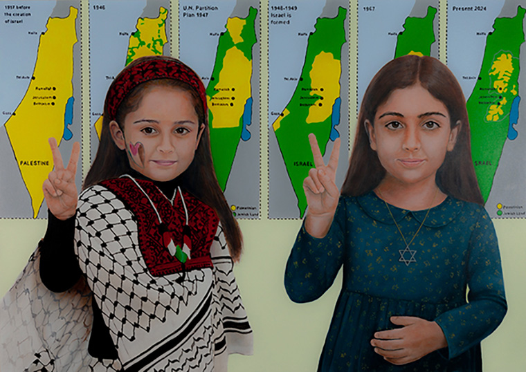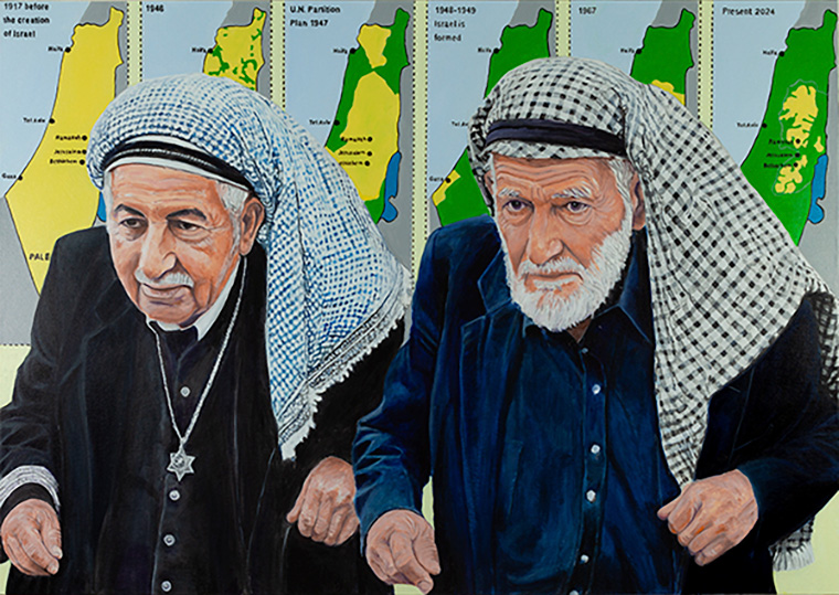 La serie si amplia ulteriormente con due opere che affrontano in modo diretto il tema della guerra e delle sue cause strutturali, per concludersi con un'immagine di forte impatto simbolico che introduce esplicitamente la questione del genocidio. Si tratta di una rielaborazione pittorica del ritratto di Anna Frank, qui raffigurata mentre scrive il suo diario, ma con indosso una kufiya palestinese: una sovrapposizione di simboli che fonde due memorie collettive - la Shoah e la Nakba - in un unico atto visivo di denuncia e di riflessione etica.